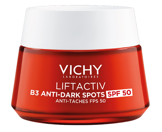 Νέα Liftactiv Β3 κρέμα με SPF50 κατά των κηλίδων, προηγμένη σύνθεση με Νιασιναμίδη (Βιταμίνη Β3) για αντιγηραντική δράση και LHA για απολέπιση σε συνδυασμό με προστασία ευρέος φάσματος SPF50 που προλαμβάνει και διορθώνει τις κηλίδες και μειώνει τις ρυτίδες.