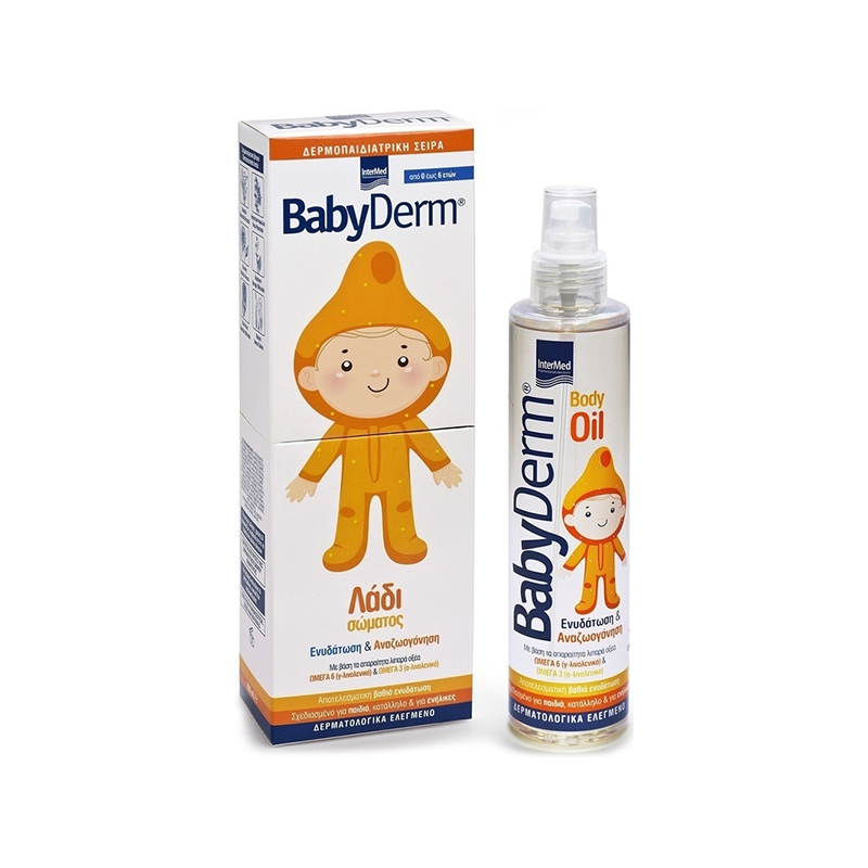 Το Babyderm Body Oil είναι ένα απαλό προϊόν βασισμένο σε φυτικής προέλευσης έλαια χωρίς παραφινέλαια που σφραγίζει την ζωτικής σημασίας υγρασία της επιδερμίδας διατηρώντας το απαλό και βαθιά ενυδατωμένο.