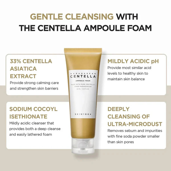 Το SKIN1004 Madagascar Centella Ampoule Foam είναι ένας απαλός αφρός καθαρισμού με ιδανικό επίπεδο pH 5 που καθαρίζει το δέρμα σε βάθος χωρίς να προκαλεί ξηρότητα. Περιέχει 84% centella και μαγειρική σόδα για να προσφέρει έναν καταπραϋντικό αλλά φυσικό καθαρισμό, αυτό το καθαριστικό αφρού προσφέρει θρέψη και αναζωογόνηση για το κουρασμένο και ερεθισμένο δέρμα. Συνδυάζεται με φυσικά φυτικά συστατικά. Βοηθά στον σχολαστικό και απαλό καθαρισμό του δέρματος με pH5, το οποίο είναι ελαφρώς όξινο, παρόμοιο με το δέρμα.