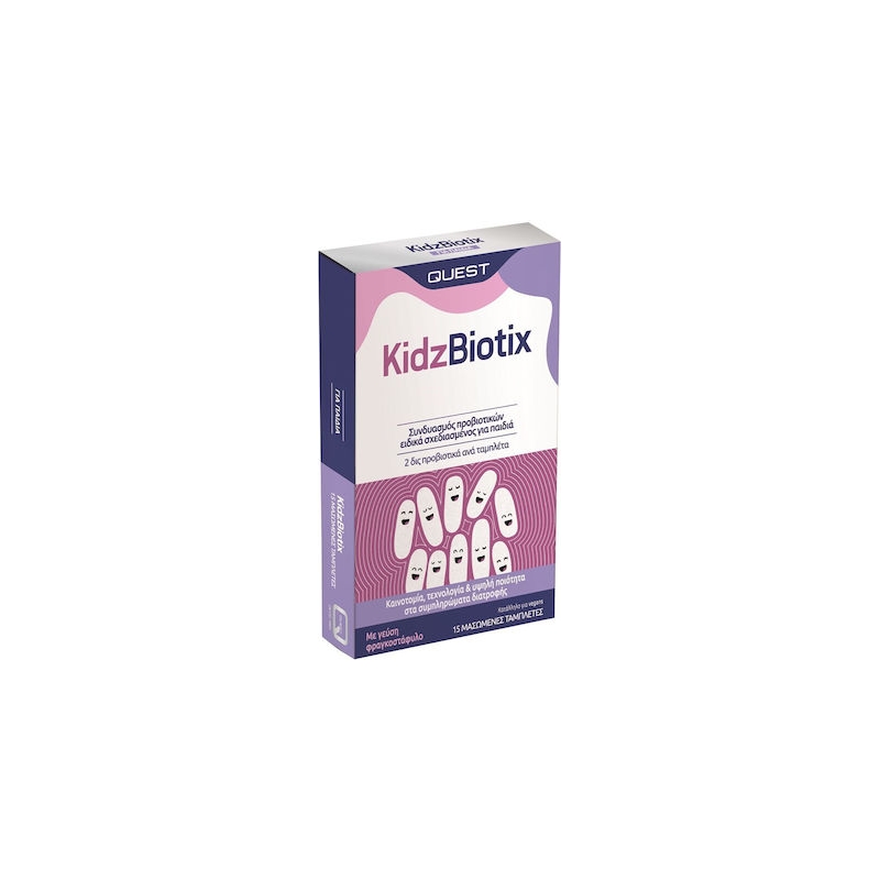 Το KidzBiotix της Quest είναι ένα συμπλήρωμα διατροφής με φιλικά βακτήρια σε μασώμενη μορφή που έχει σχεδιαστεί ειδικά για την καλή λειτουργία του παιδικού εντέρου.